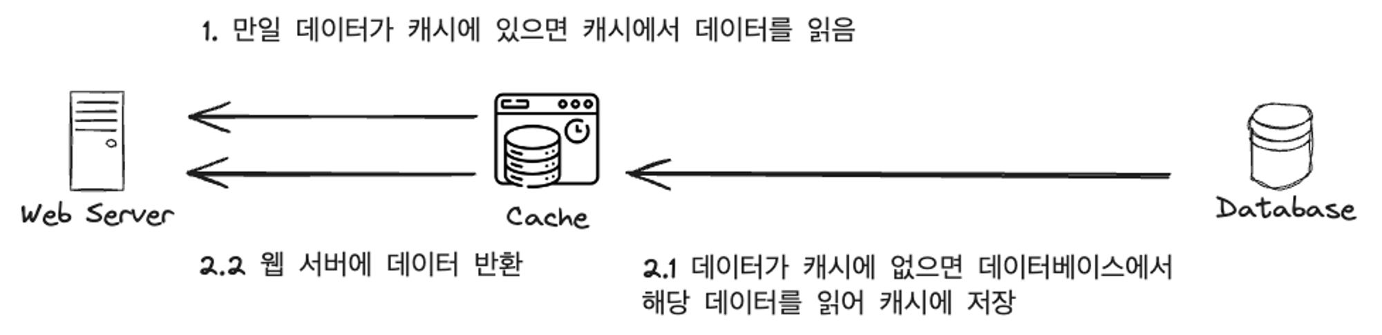 서버와 데이터베이스 중간에 위치시켜서 이전에 조회했던 데이터에 대해서는 데이터베이스에서 조회하지 않고, 캐시에서 바로 데이터를 가져와서 응답함으로써 성능 개선과 데이터베이스의 부하를 줄일 수 있고, 캐시 계층의 규모를 독립적으로 확장시키는 것도 가능해집니다.