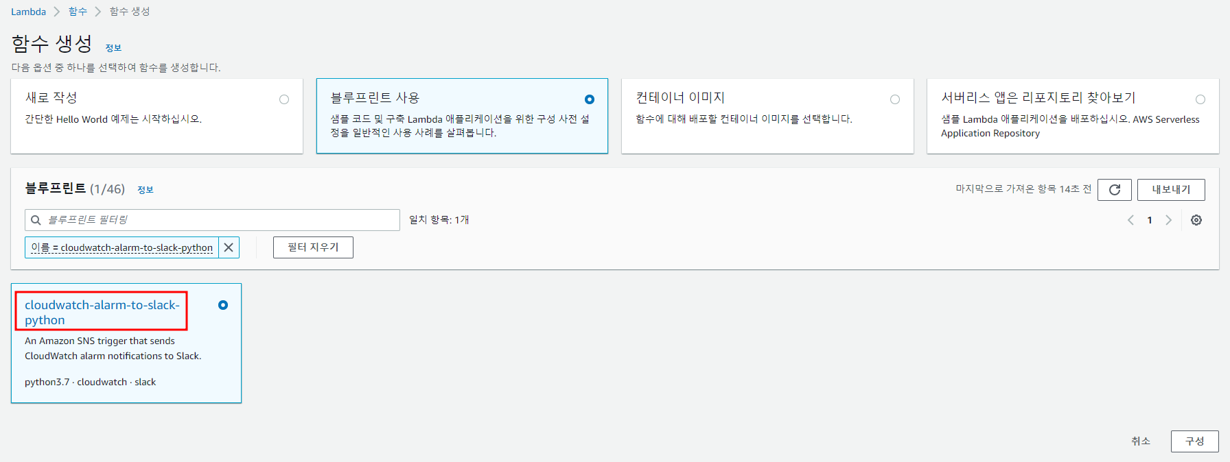- 블루프린트 사용: cloudwatch-alarm-to-slack-python