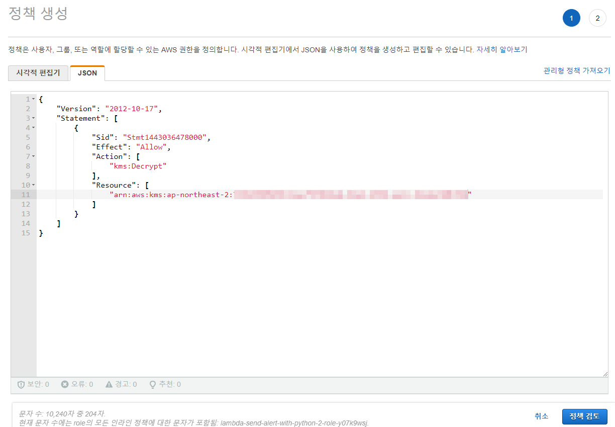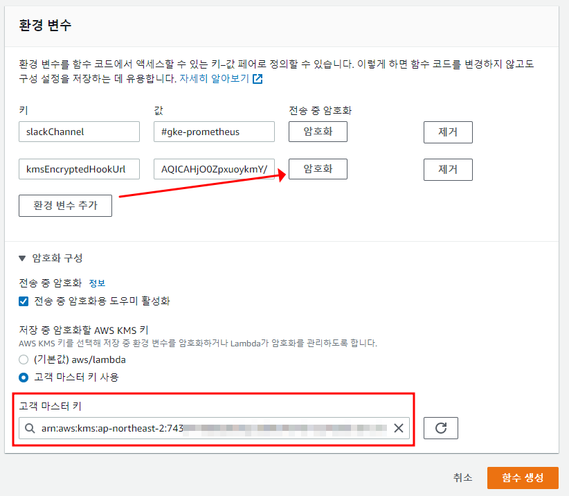 - 위에서 생성한 KMS key를 이용하여 HookUrl만 암호화를 진행한다.