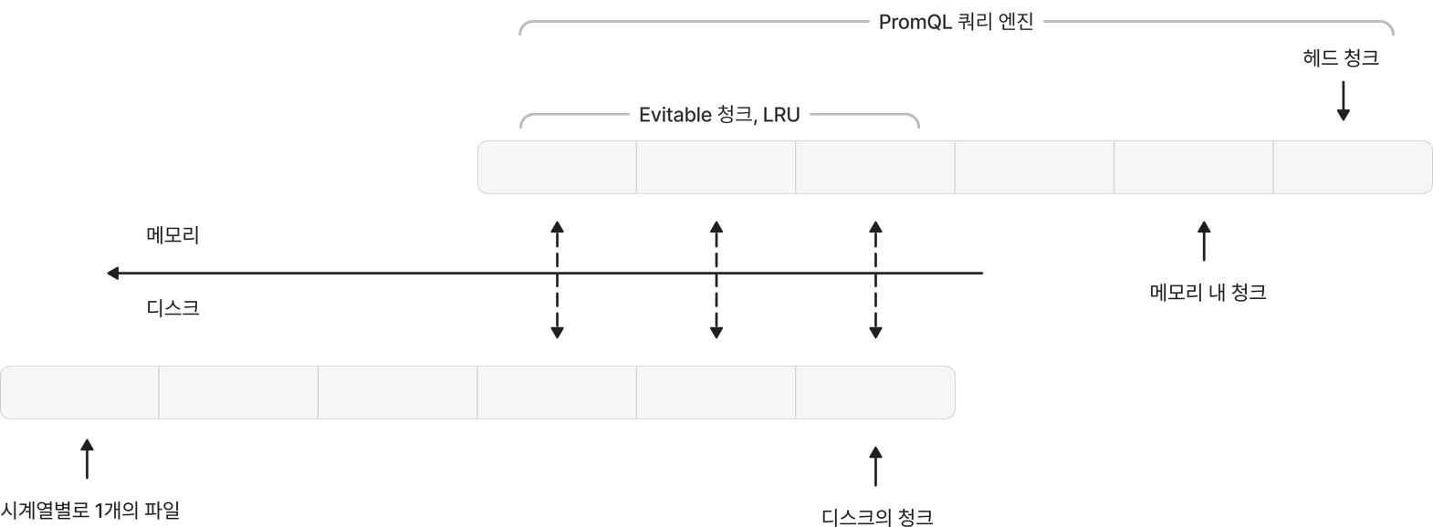 - PromQL의 쿼리가 현재 메모리에 없는 청크를 필요로하면 디스크 청크를 메모리에 로드 합니다.