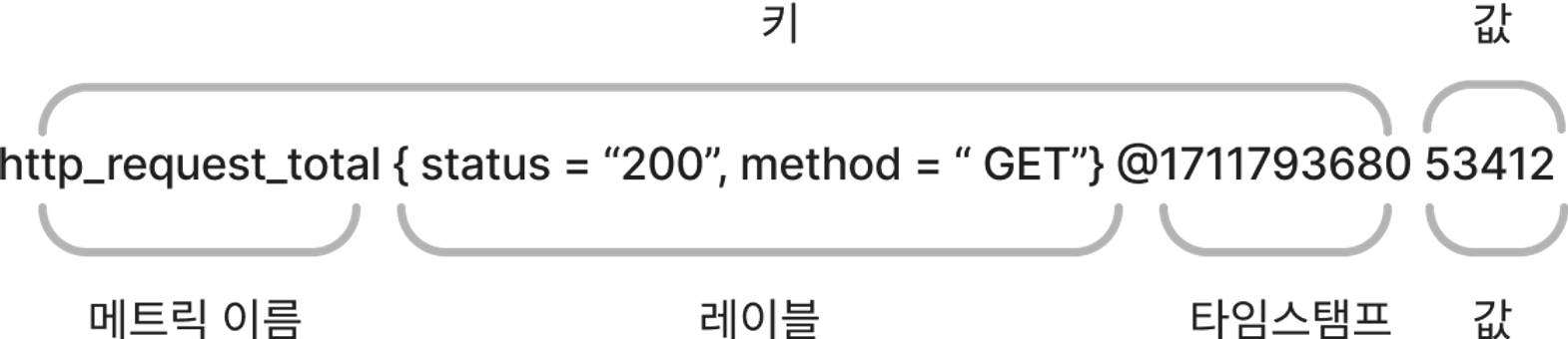 프로메테우스는 메트릭 이름, 레이블, 타임스탬프의 조합을 키-값 형식으로 사용합니다. 이러한 구조는 시계열 데이터의 효율적인 조회와 관리를 가능하게 합니다.