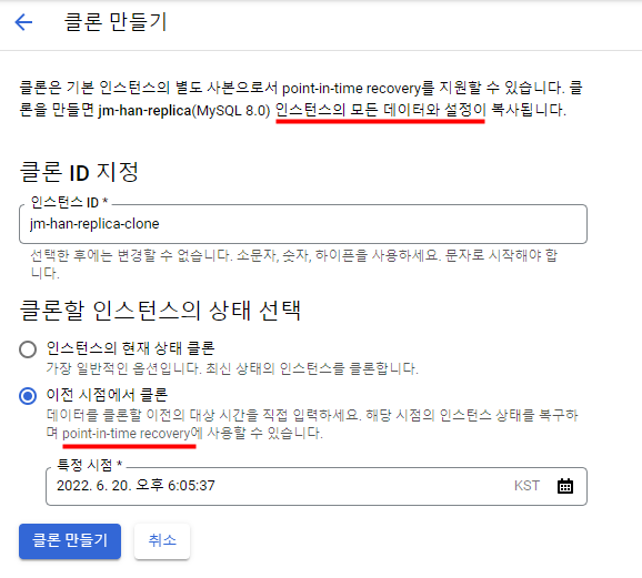 - point-in-time recovery 설정을 변경하려면 인스턴스를 다시 시작해야 합니다.