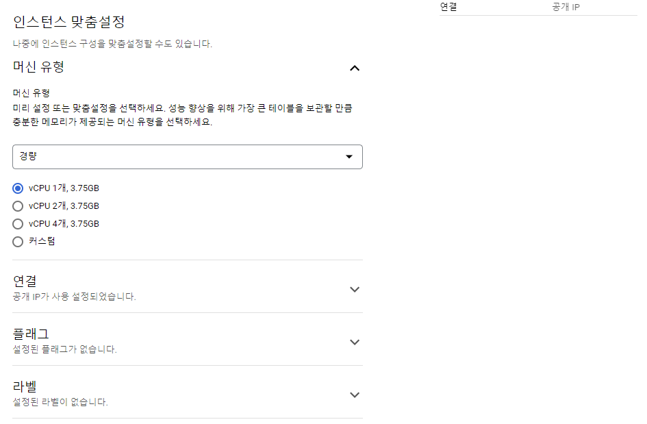 - 인스턴스 구성 (플래그, 연결 옵션, 머신 유형, 스토리지, 메모리 설정)