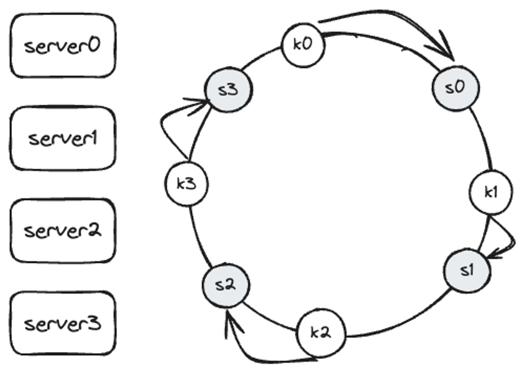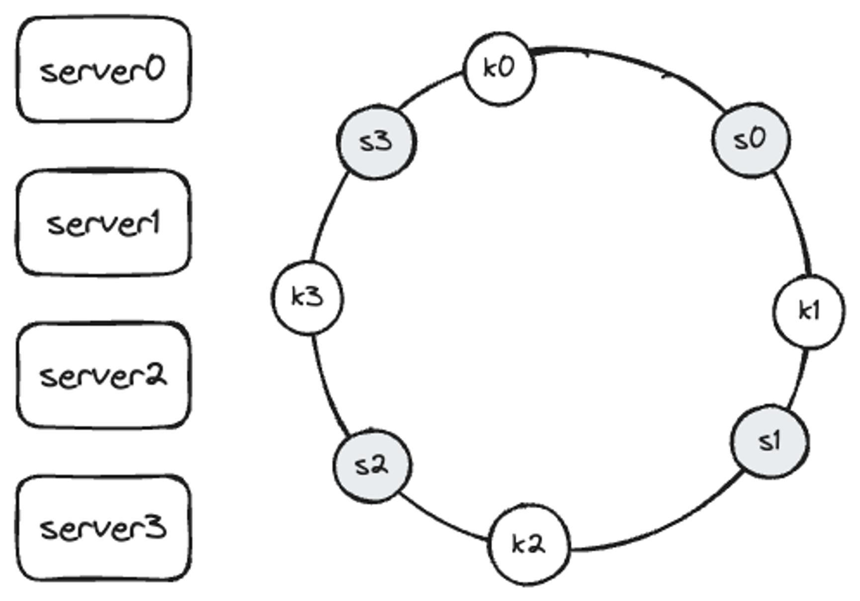 캐시할 키 key0, key1, key2, key3 또한 해시 링 위의 어느 지점에 배치할 수 있습니다.