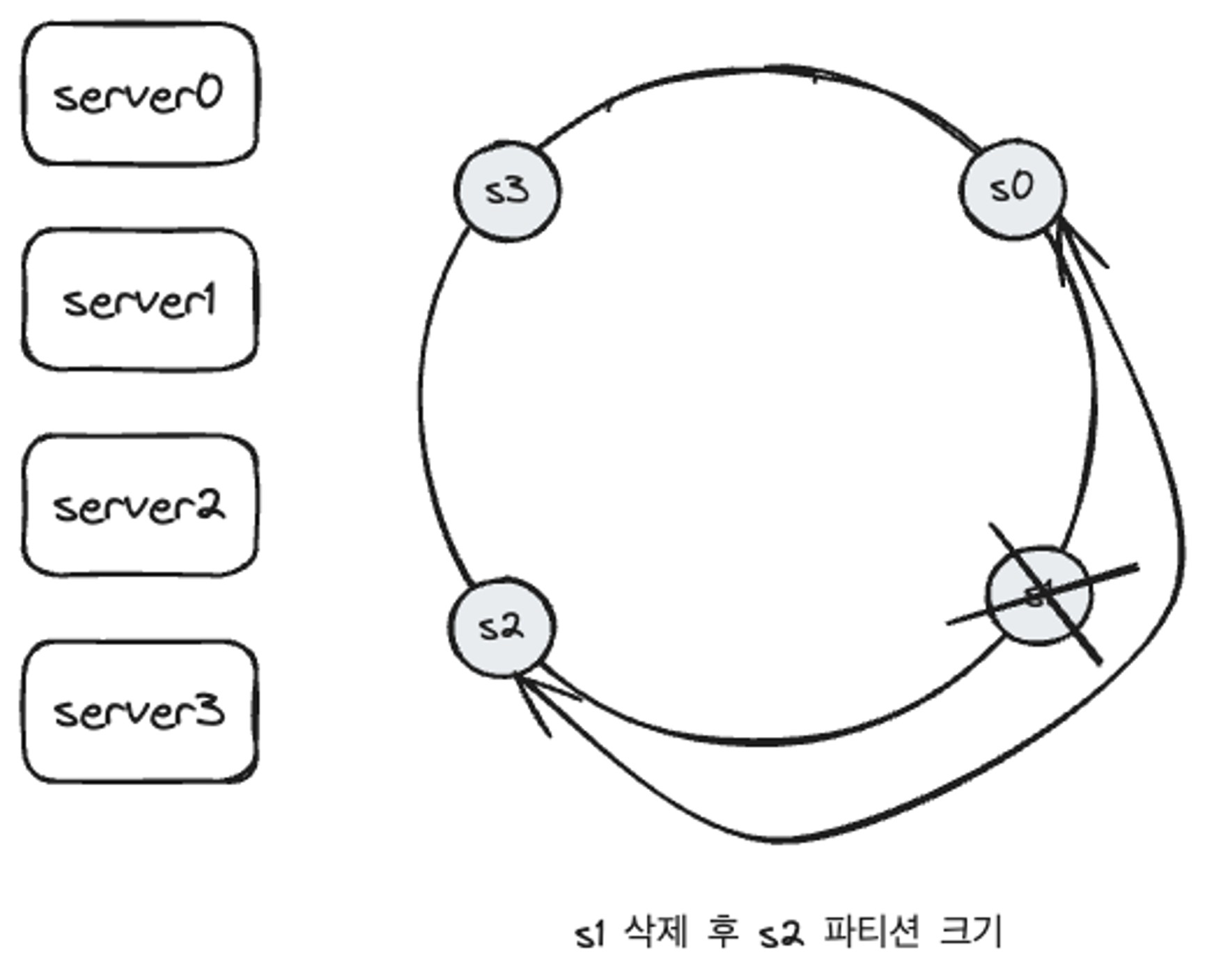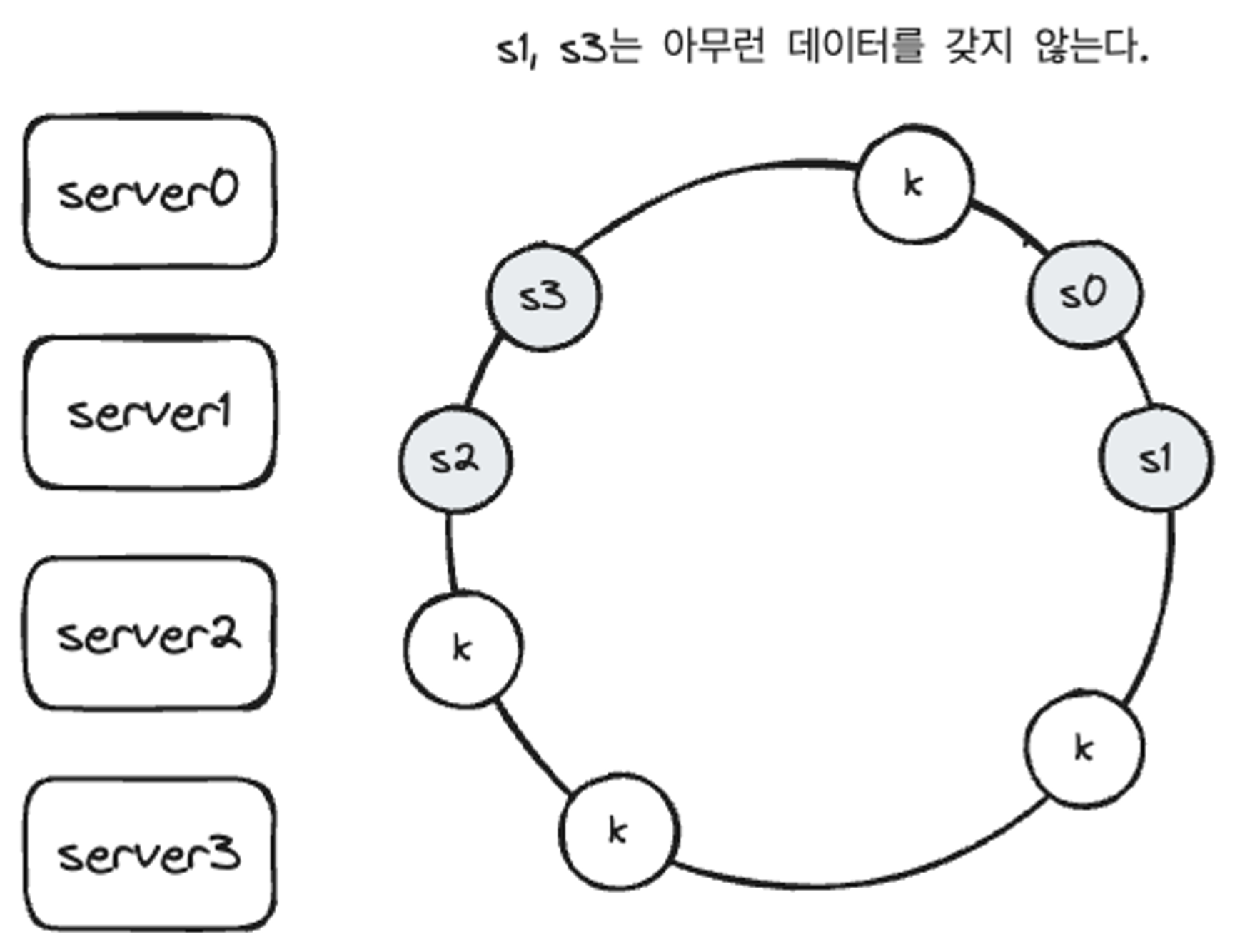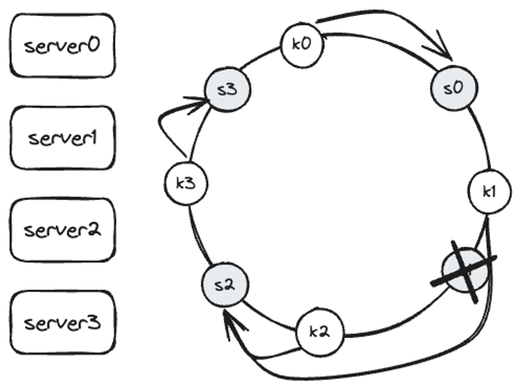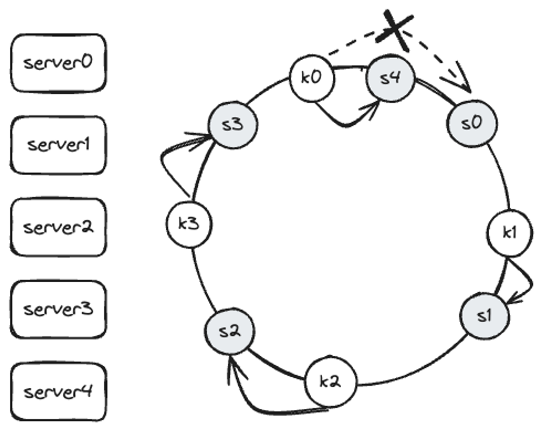 server4가 추가 되기 전 key0은 서버 0에 저장되어 있었다. key0의 위치에서 시계 방향으로 순회했을 때 처음으로 만나게 되는게 server4이기 때문에 server4가 추가된 뒤에 key0은 server4에 저장된다.
