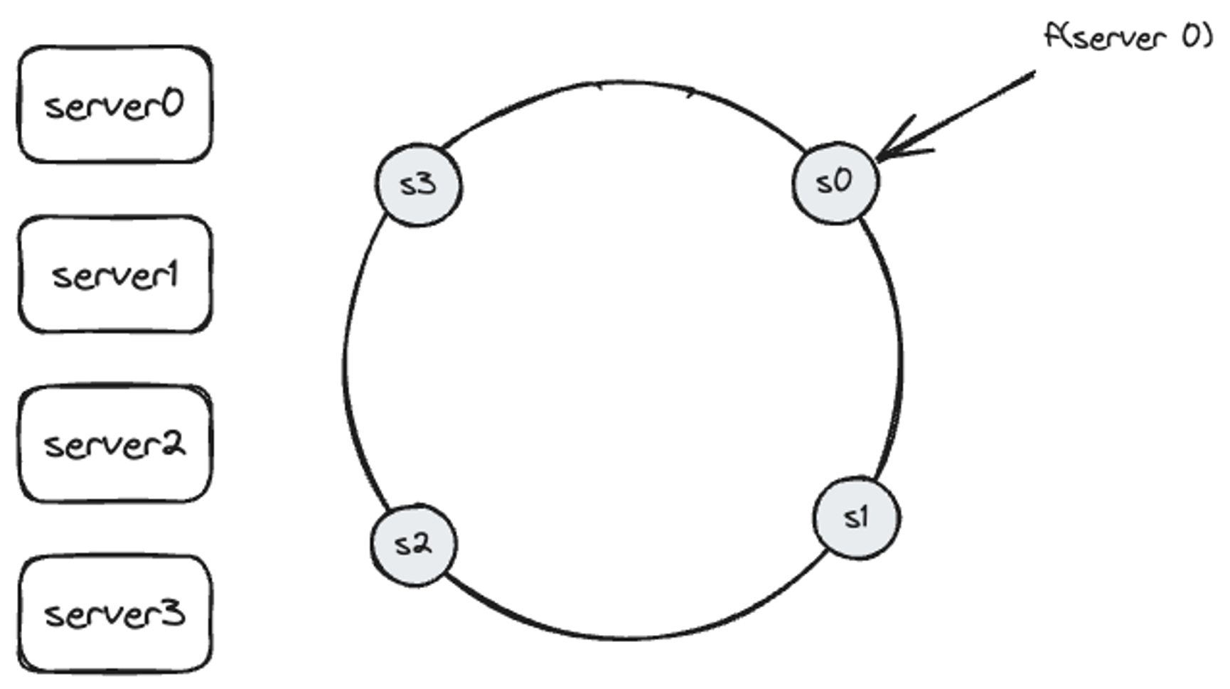 서버는 해시 링 위의 한 지점에 배치됩니다. 이 위치는 해시 함수 f를 사용하면 서버 IP나 이름을 이 링 위의 어떤 위치에 대응할 수 있습니다.