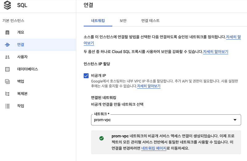 원본 인스턴스에서 비공개 IP 사용 설정 필요