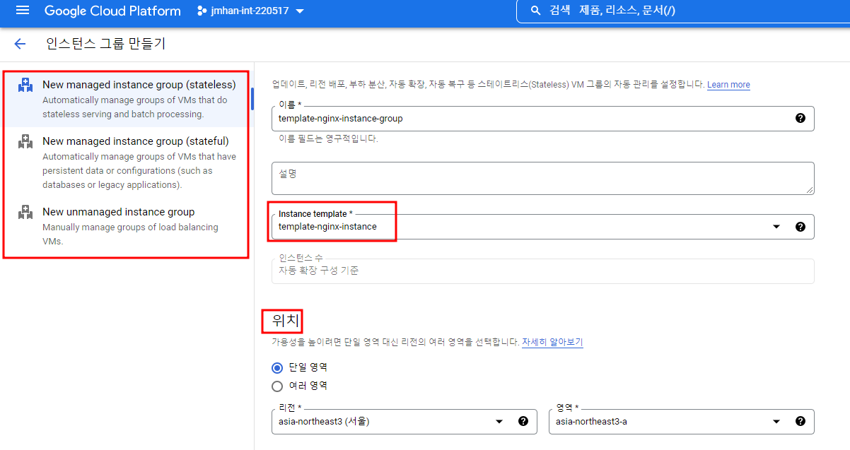 - 생성한 인스턴스 템플릿의 위치와 인스턴스 그룹의 위치를 일치 시켜야 생성 가능하다.