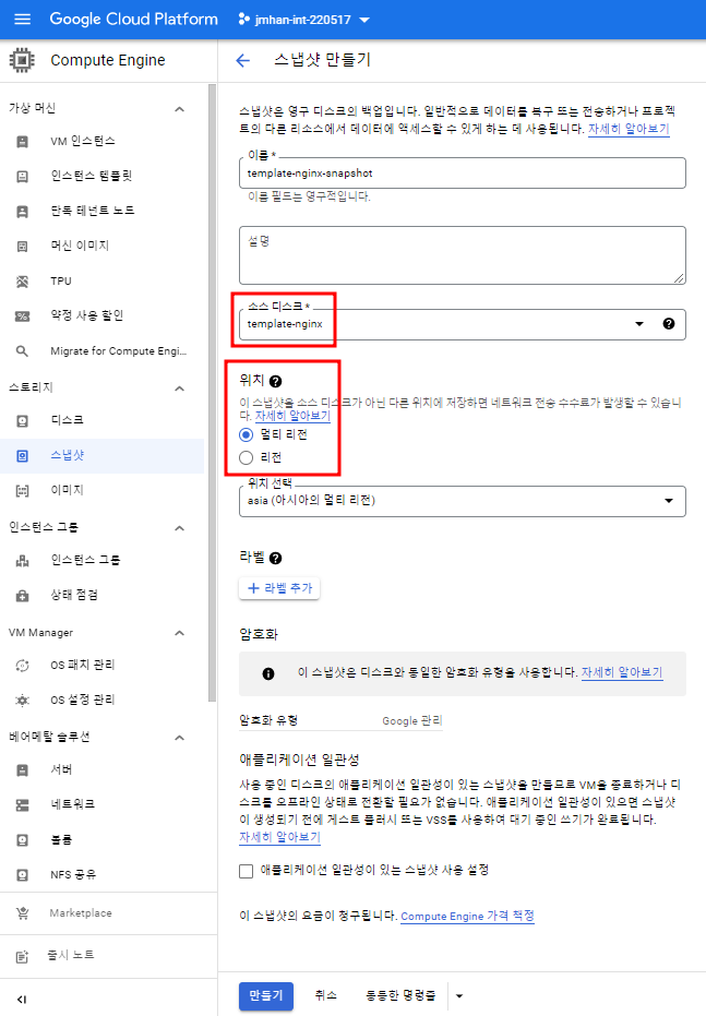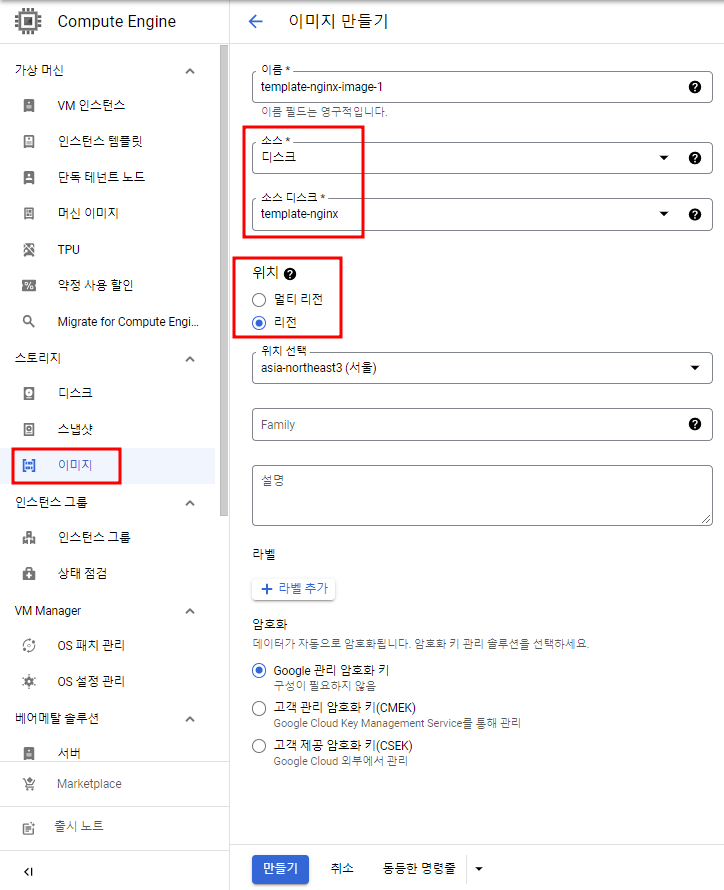 - 위치는 멀티 리전 또는 리전을 선택할 수 있다. 목적에 맞게 선택하여 인스턴스 템플릿을 생성한다.