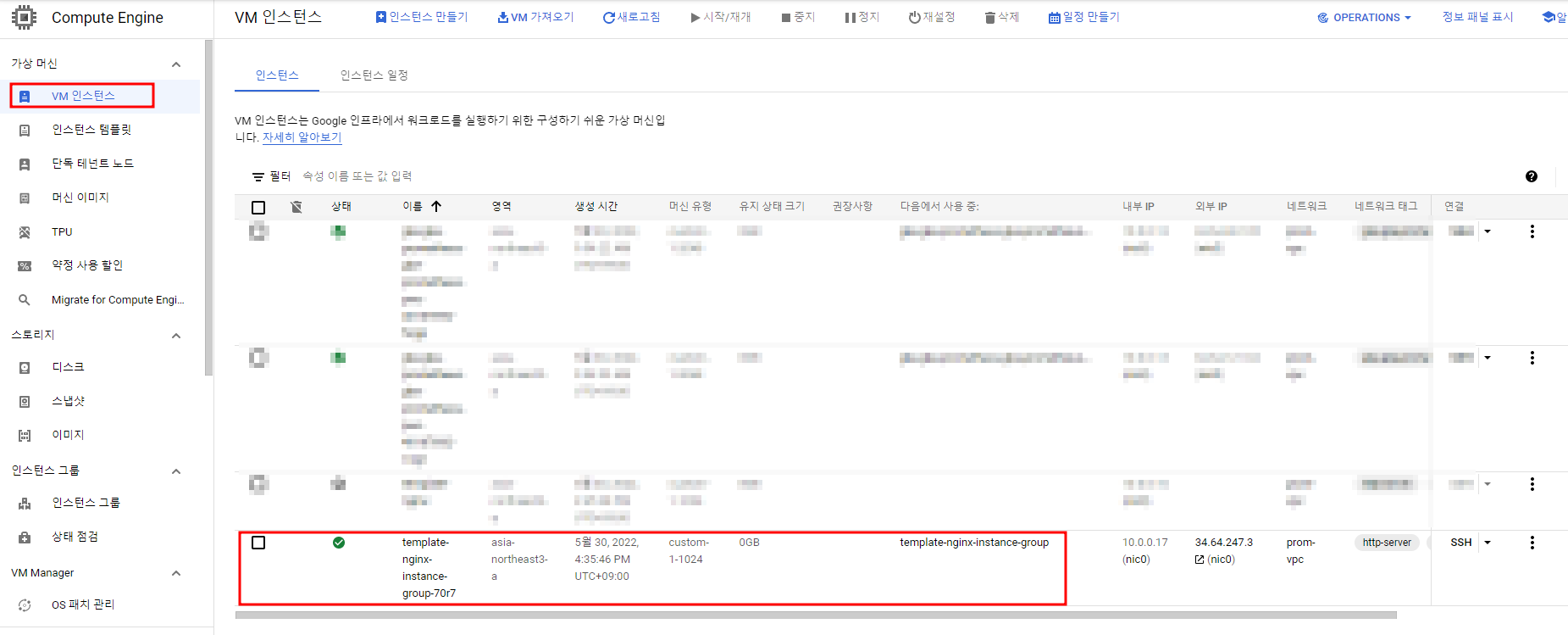 VM 인스턴스에서 인스턴스 그룹에서 관리하고 있는 VM 인스턴스를 확인할 수 있다.
