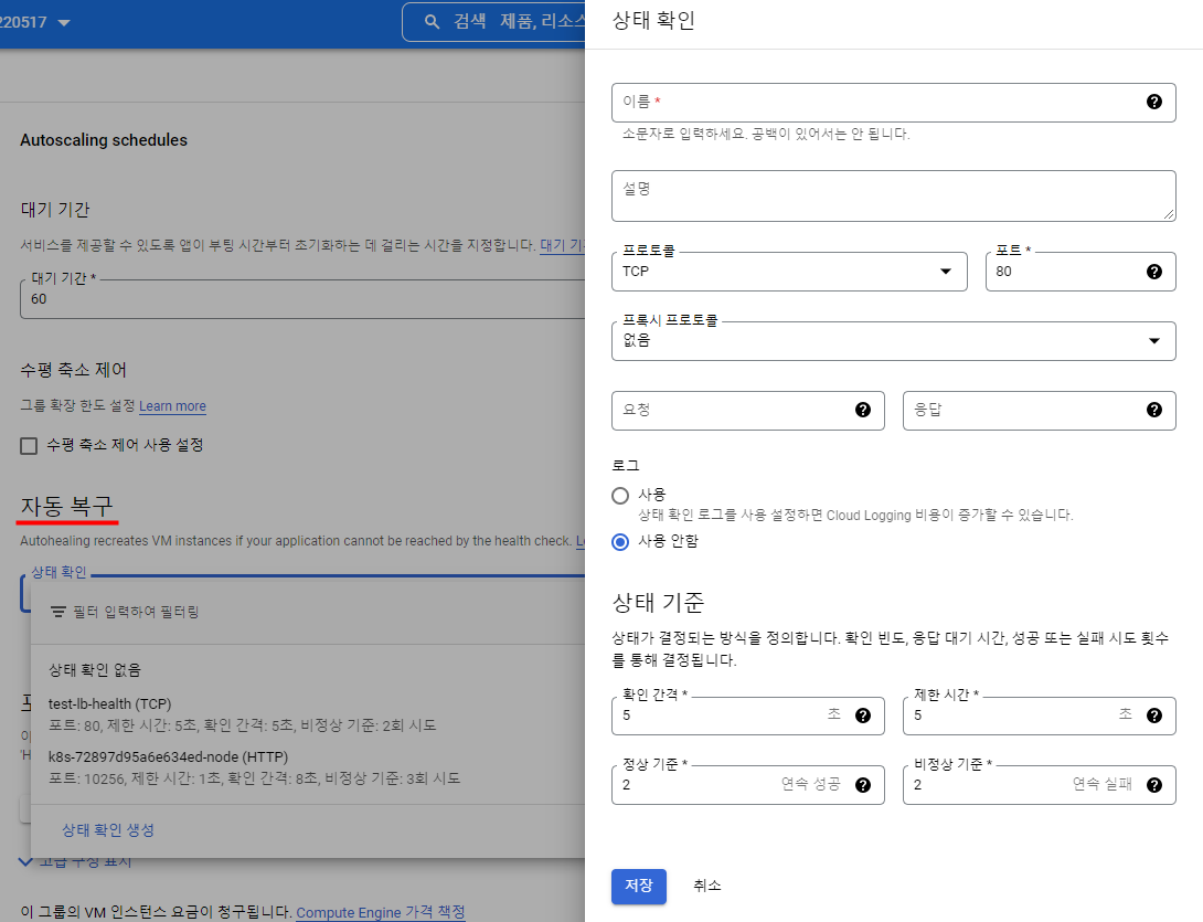 - 인스턴스 그룹에 health check 기능을 추가하여 생성한 vm instance에 문제가 생긴 경우 자동 복구 기능을 사용할 수 있다.