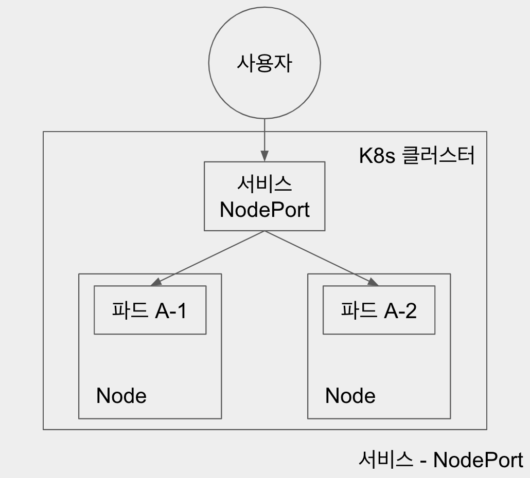 사용자는 서비스(NodePort)를 통해 모든 노드의 지정된 포트로 파드에 접근할 수 있다.