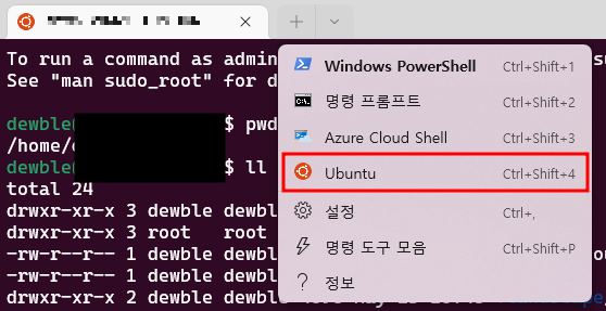 - 설치 후 프로그램을 실행시킨 뒤 터미널을 Ubuntu로 설정하고 명령어를 확인해 본다.