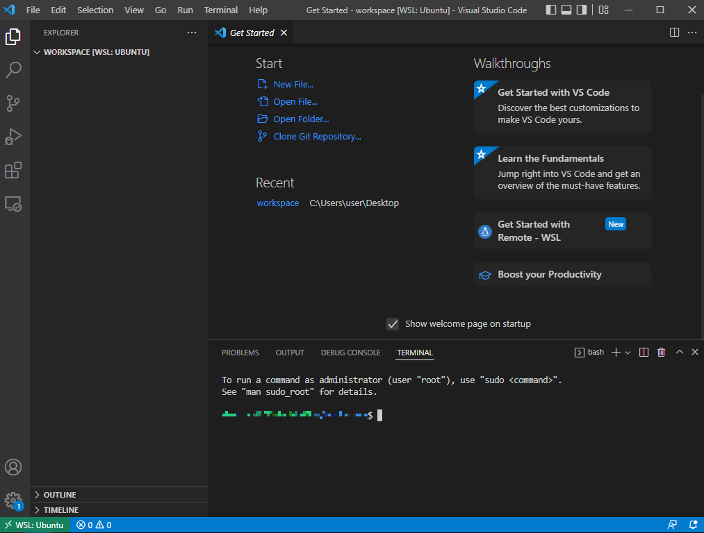 - 터미널을 사용하면 WSL:Ubuntu를 사용할 수 있다.
