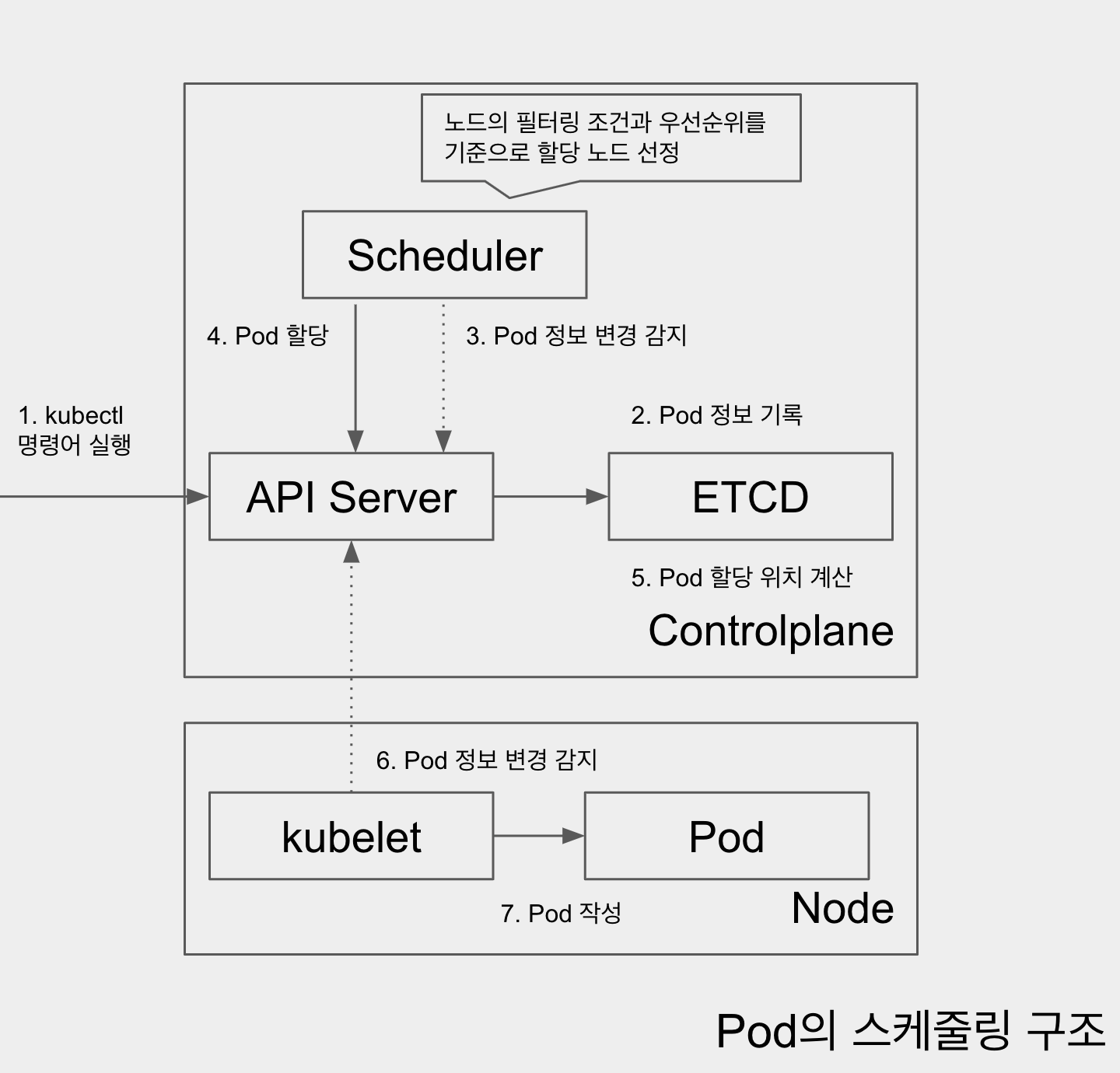 스케줄러는 클러스터 상에 포드를 배치하는 것을 정하는 컴포넌트이다. 스케줄러는 클러스터 구성에 변경이 없는지를 확인하기 위해 API Server(Pod API)를 항상 감시하고 있다. 그래서 스케줄러가 (2) 의 변화를 감지한다.
