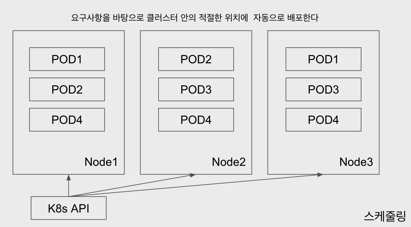기존 시스템에서는 어디에서 어떤 어플리케이션이 움직이고 있는지 알고 있어야 했다. 하지만 쿠버네티스에서는 어플리케이션이 배포되는 위치가 쿠버네티스에 의해 정해진다. 어플리케이션이 배포되면 쿠버네티스가 클러스터 상에서 비어 있는 위치를 찾아내서 자동으로 배치한다.