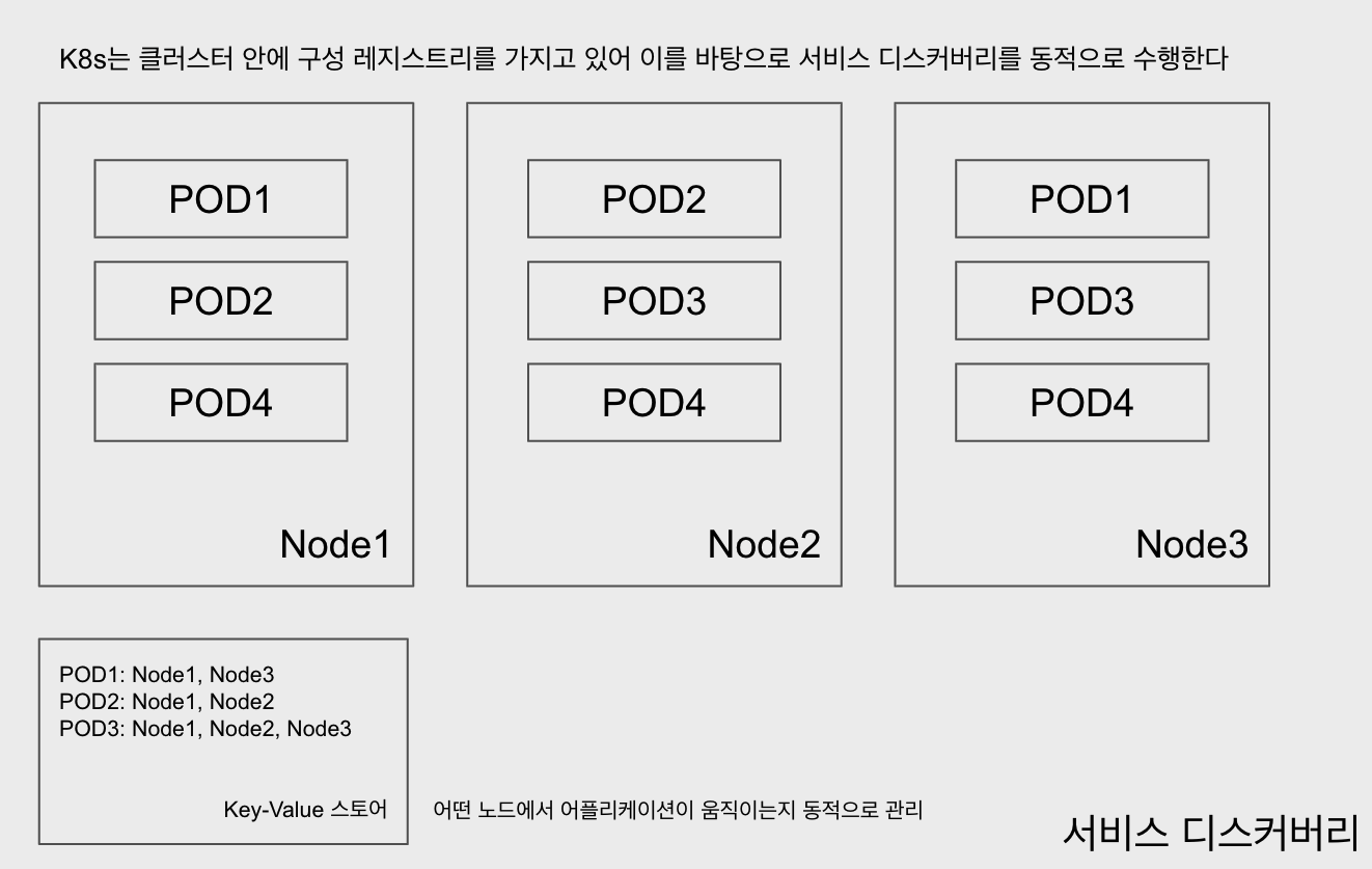 쿠버네티스에서는 클러스터 안에 구성 레지스트리를 갖고 있어서 이를 바탕으로 서비스 디스커버리를 동적으로 수행한다.