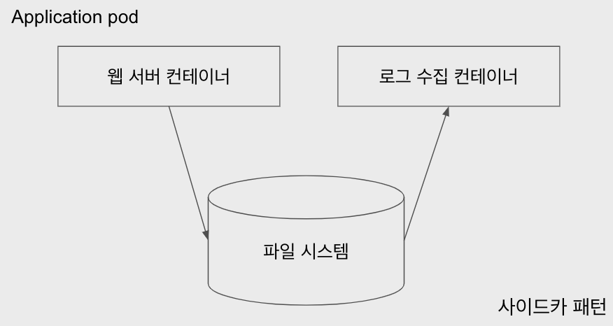 - 그럼 사이드카 역할인 로그 수집 컨테이너는 파일 시스템에 쌓이는 로그를 수집해서 외부의 로그 수집 시스템으로 보낸다.