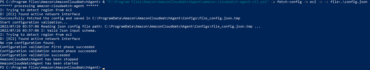 & "C:\\Program Files\\Amazon\\AmazonCloudWatchAgent\\amazon-cloudwatch-agent-ctl.ps1" -a fetch-config -m ec2 -s -c file:.\\config.json