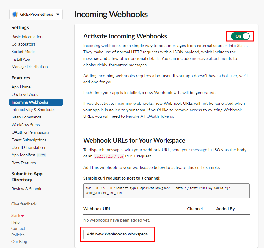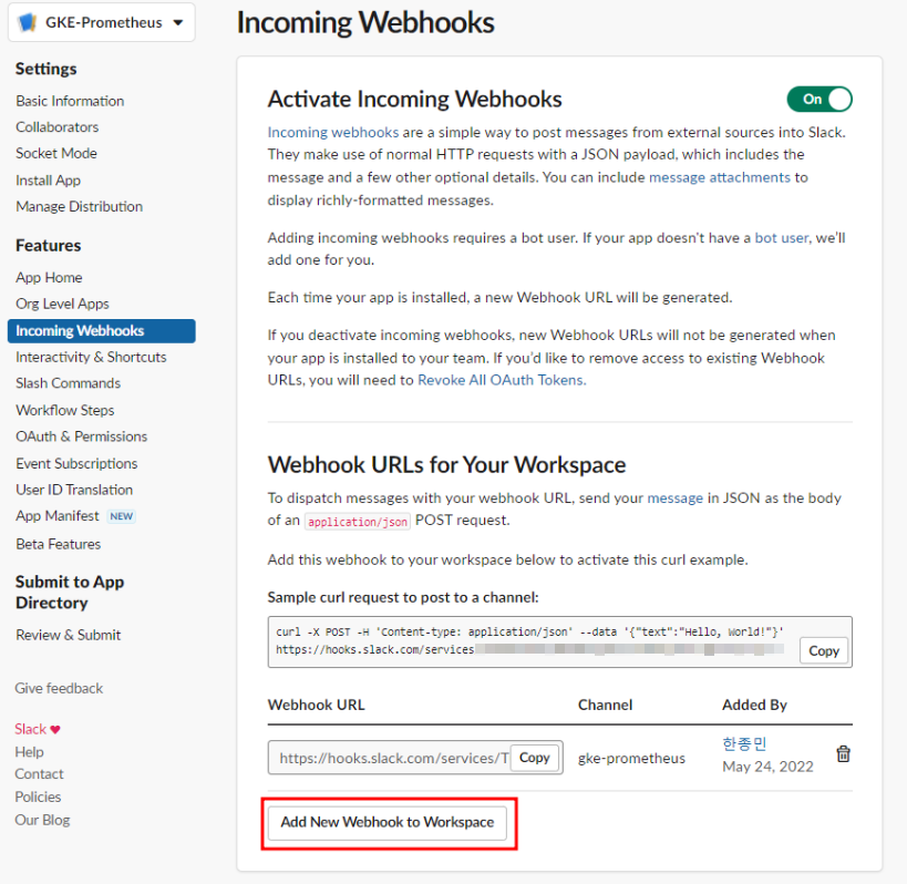 - 워크스페이스에 새 웹후크 추가를 클릭합니다(. (Add New Webhook to Workspace)