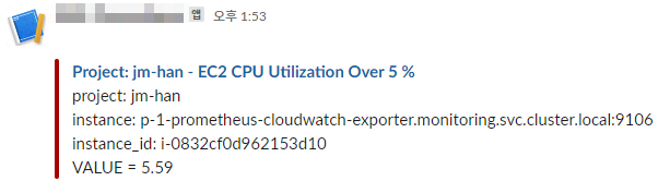 임계치가 넘었을때 위 slack_config에 작성한 title, text에 해당하는 메세지를 받을 수 있는지 확인한다.