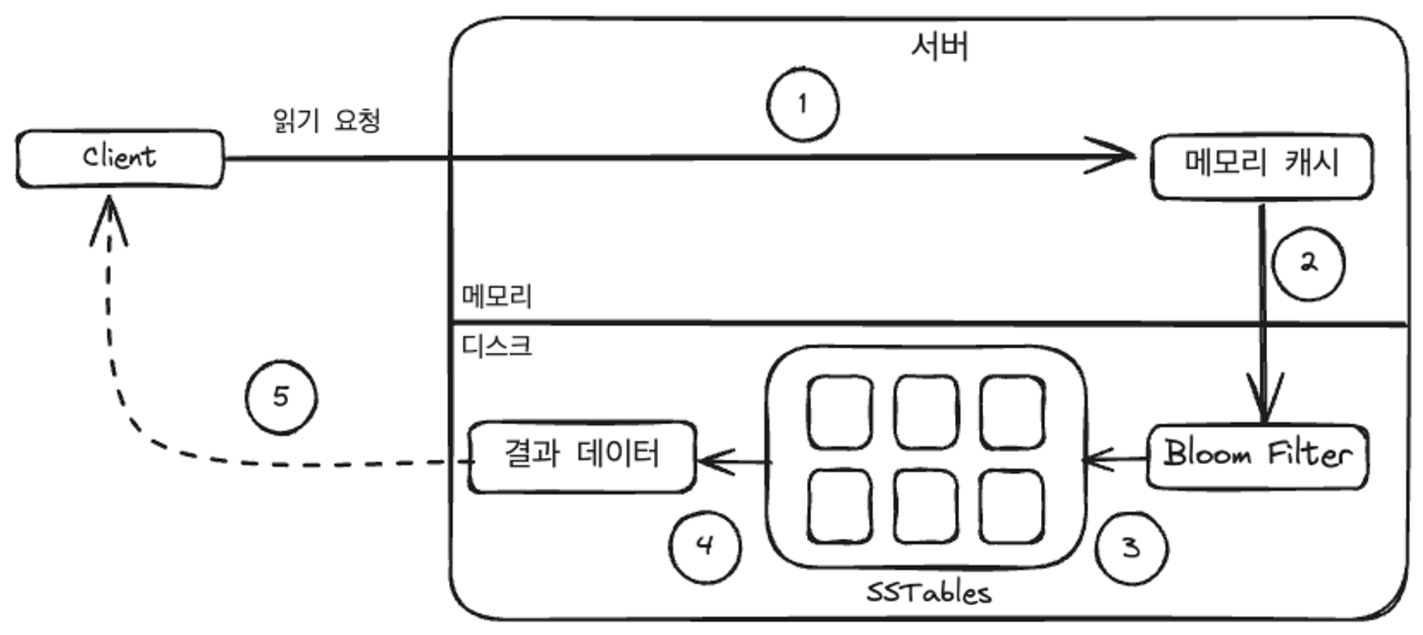 - 블룸 필터를 통해 어떤 SSTable에 키가 보관되어 있는지 알아냅니다.