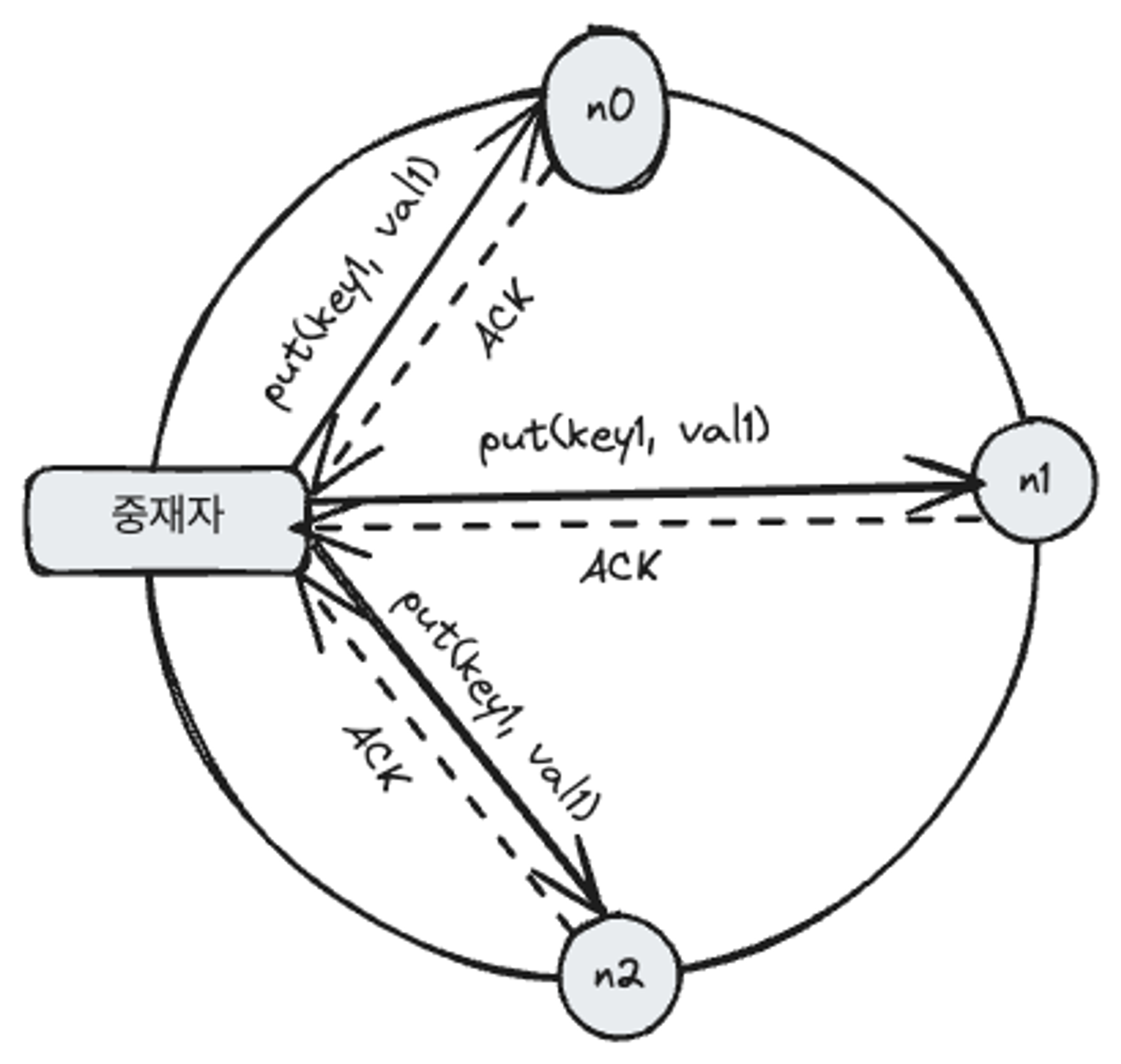 예를 들어 N=3, W=1의 의미는 쓰기 연산이 성공했다고 판단하기 위해서는 중재자(coordinator)는 최소 한대 서버로 부터 쓰기 성공 응답을 받아야 한다는 뜻이다. 따라서 n1으로부터 ACK를 받았다면 n0, n2로 부터의 응답은 기다릴 필요가 없다.