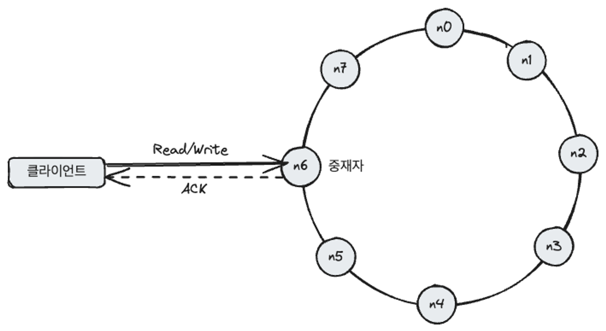 - 노드들은 안정 해시 링 위에 분포되어 있습니다. 안정 해시 설계(consistent hash) 참고