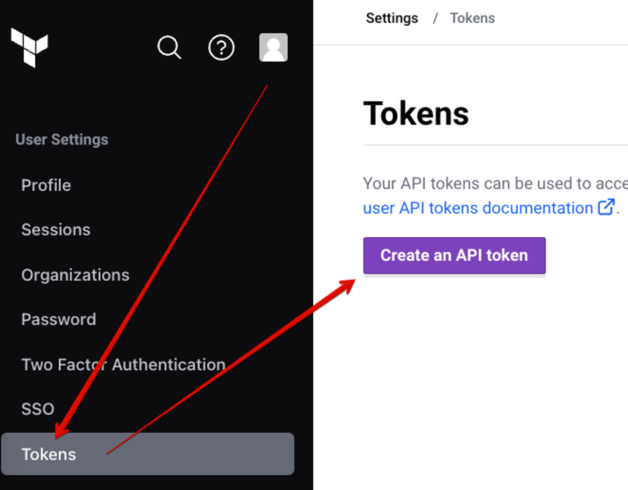 3. Terraform Cloud API 토큰 생성: Terraform CLI와 Terraform Cloud 간의 인증을 위한 토큰을 생성합니다.