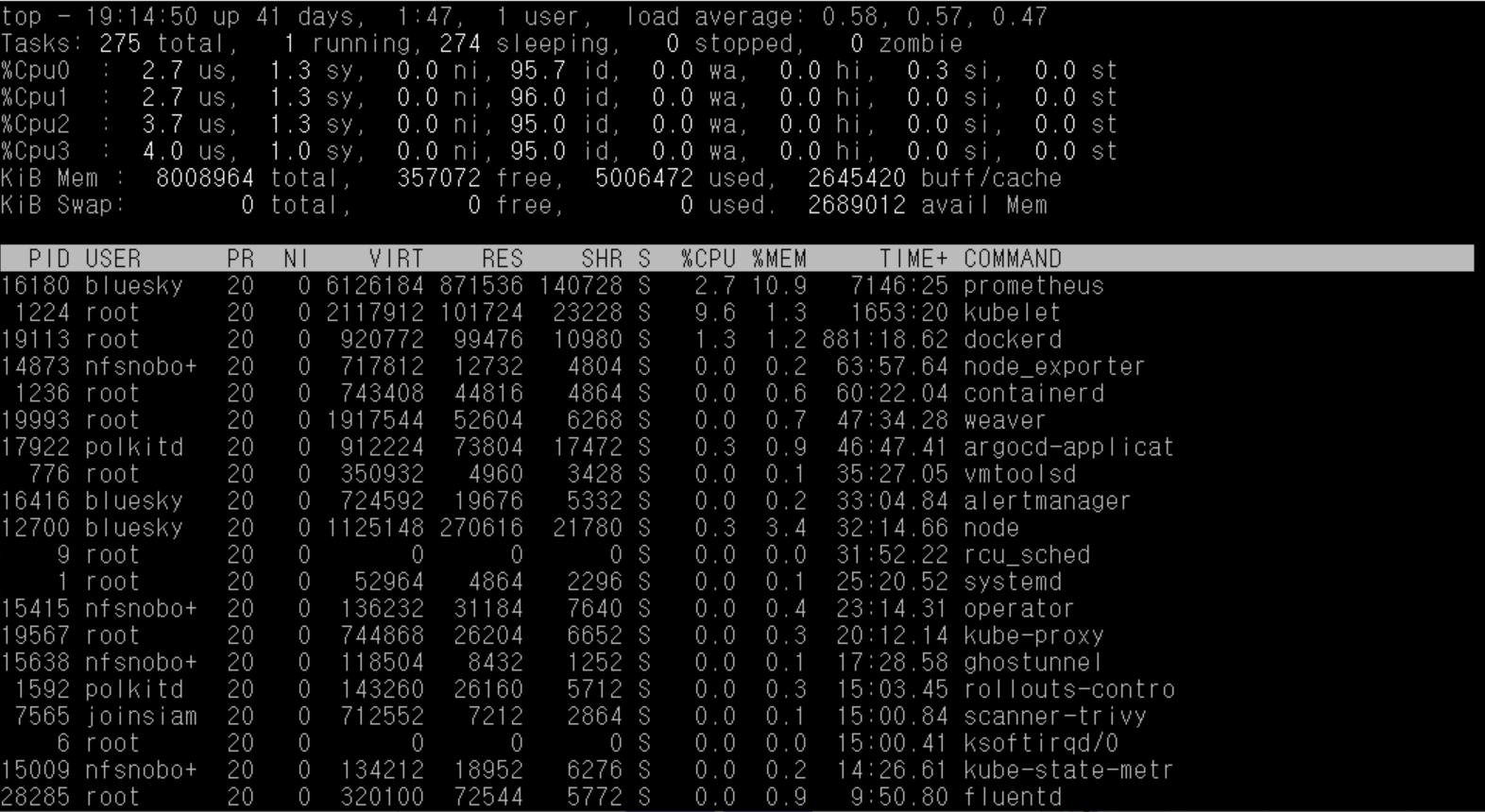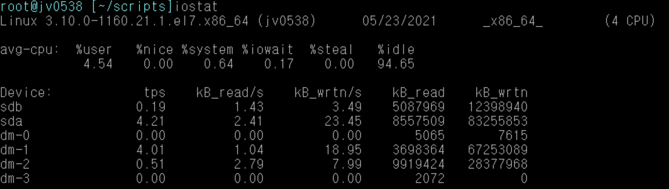 I/O 대기 시간은 낮고 유휴 시간값(id)은 높다면 시스템이 느려진 원인은 CPU 자원 때문에 발생하는 것이 아니므로 다른 곳에서 시작해야 한다.