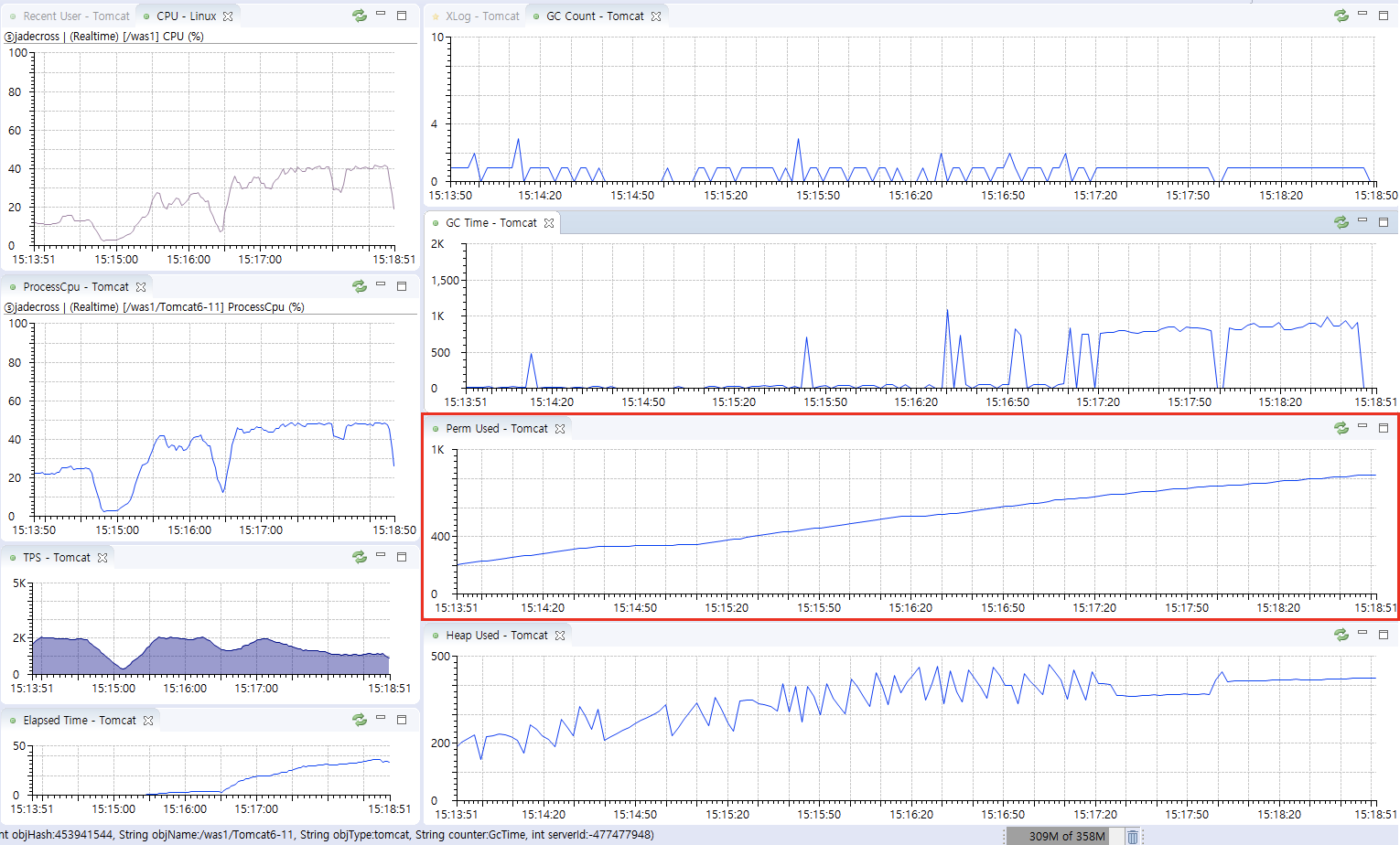 Heap 메모리가 올라가면 GC Time과 Count가 올라가고 이때문에 CPU 또한 상승하게 된다.