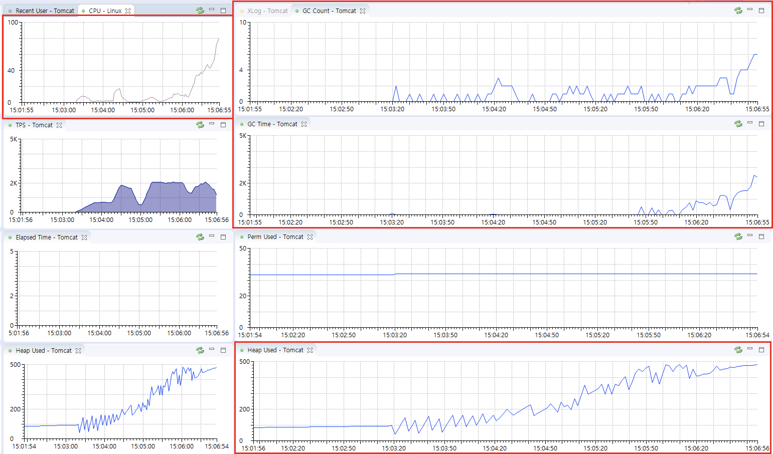 Heap 메모리가 올라가면 GC Time과 Count가 올라가고 이때문에 CPU 또한 상승하게 된다.