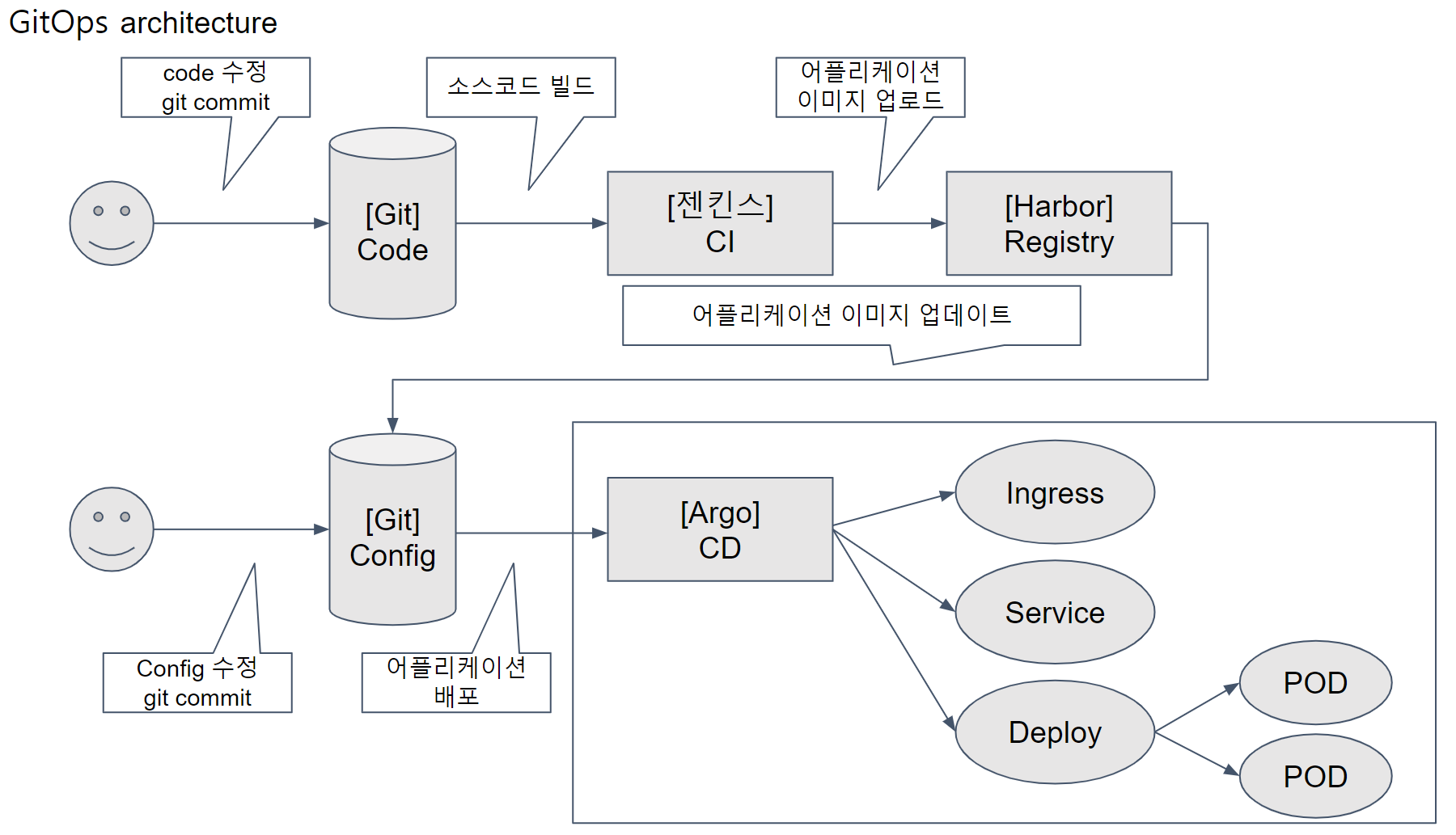 - 배포에 관련된 모든 것을 선언형 기술서(Declarative Descriptions) 형태(yaml) 로 작성하여 Config Repository에서 관리한다. → Git